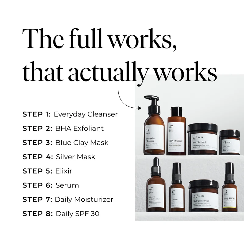 Founded by Nic Taylor after a personal struggle with persistent skin problems, 47Skin started in 2017 and claims to use silver-based antibacterial technology to tackle blemishes at their root. The brand positions itself as clinical yet accessible, offering serums, masks, cleansers and bundle kits aimed at spot treatment, scar repair and overall skin clarity